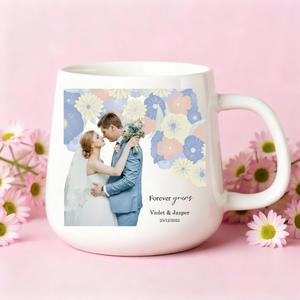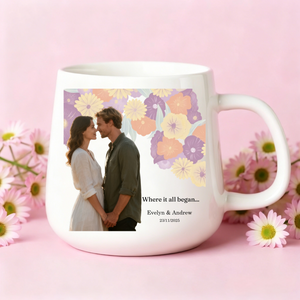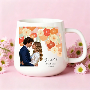 Capture life's most romantic moments with our Floral Couple Photo Mug. This elegant white ceramic mug features your special couple photo alongside beautiful floral designs, personalized with meaningful quotes, both names, and your significant date.Â
