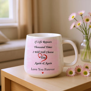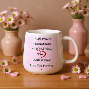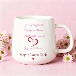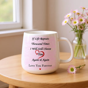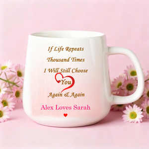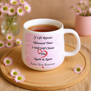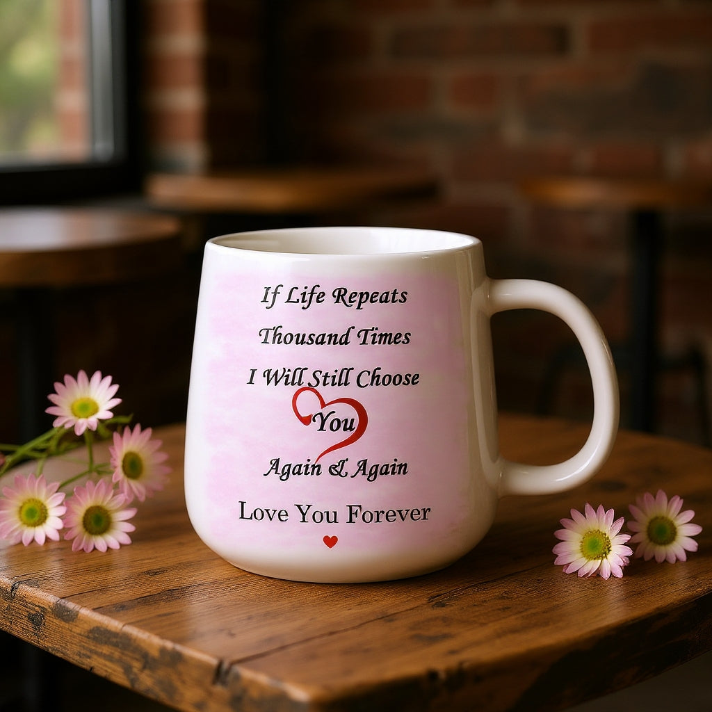 Design a unique expression of love with our personalized romantic mug. Featuring the heartfelt quote "If Life Repeats Thousand Times I Will Still Choose You Again & Again"as inspiration, this 400ml ceramic mug lets you customize every detail. Perfect for anniversaries, Valentine's Day, or just to say "I love you" in the most special way.