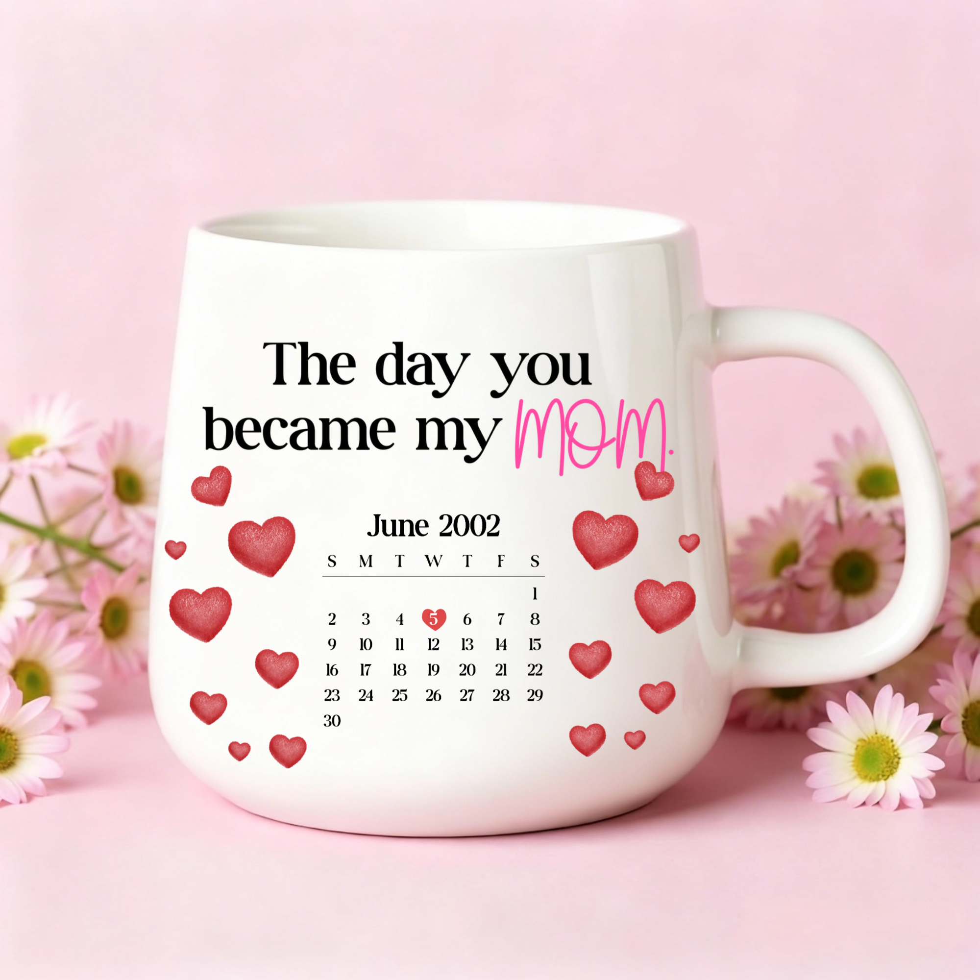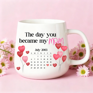 Design: Features the core message “The day you became my mom.”, a customizable monthly calendar, and decorative heart balloons or scattered hearts.