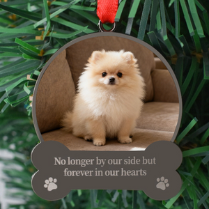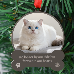 Honor the memory of your furry friend with our heartfelt Bone Shape Pet Memorial Ornament. This beautifully crafted zinc alloy ornament features a circular frame for your pet's photo, accompanied by the touching quote "No longer by our side but forever in our hearts." Whether it's a loyal dog or a cherished cat, this personalized keepsake helps you keep their memory alive during the holidays and beyond.