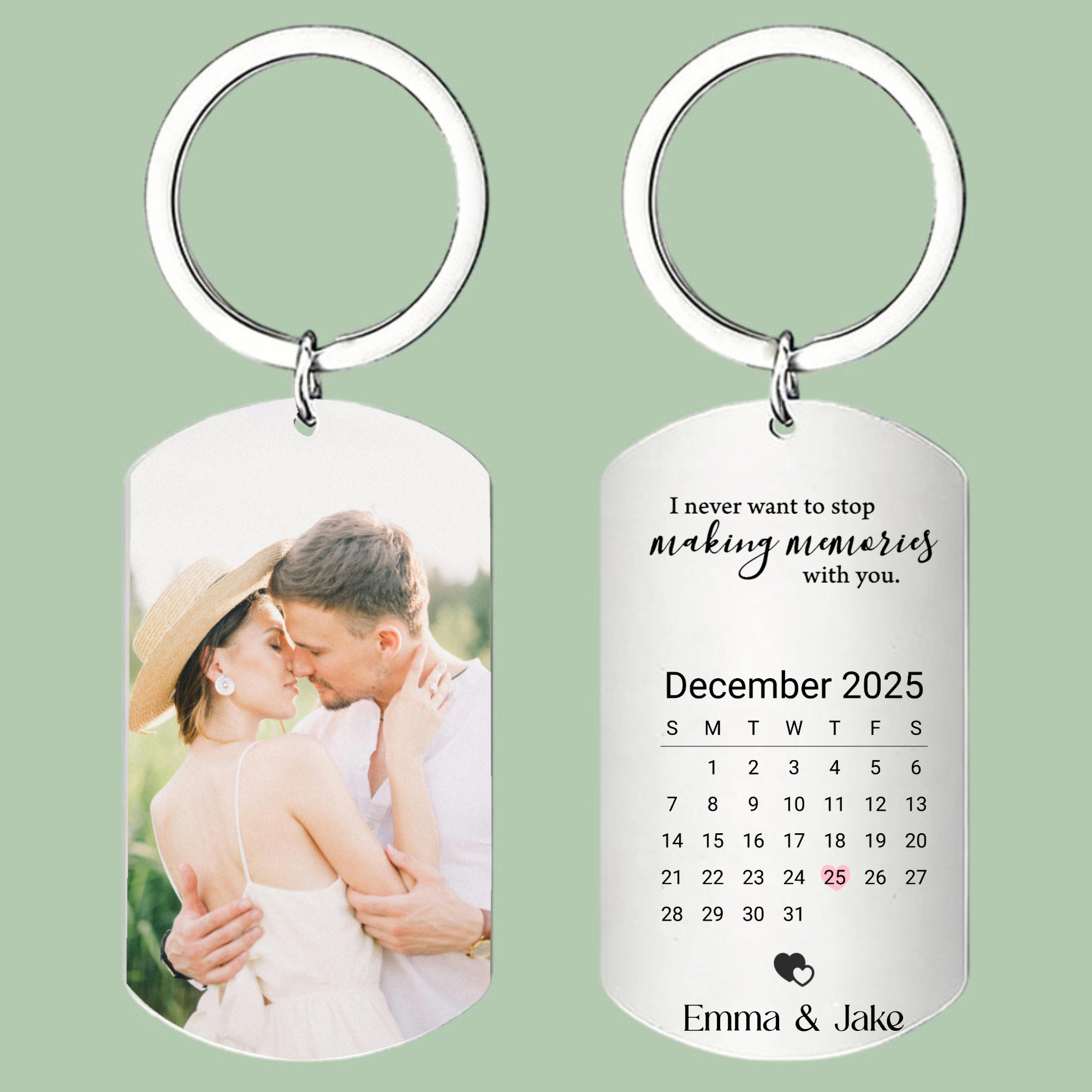 Keep your most cherished memories close with our Personalized Photo Keychain. Made from durable stainless steel, this elegant keychain features a 50x28mm rectangular plate perfect for your favorite couple photo. Customize it with romantic quotes, both of your names, and a special date highlighted on a calendar. Itâs a daily, tangible reminder of your bondâpractical, sentimental, and built to last.