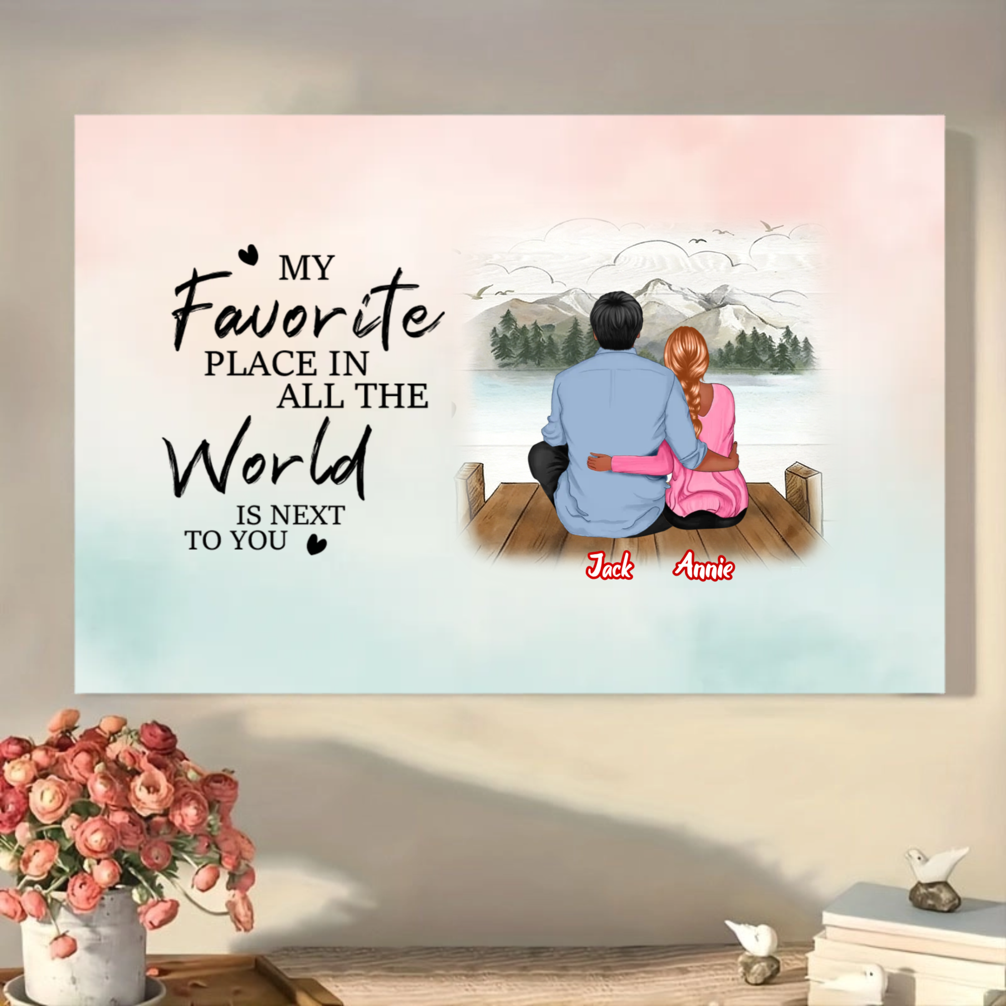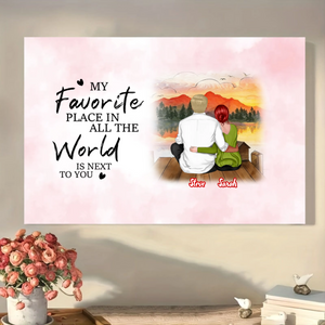 Celebrate your unique bond with a personalized canvas print that captures your "favorite place." Choose between two meaningful customization styles: upload a cherished real photo, or create a custom avatar by selecting hairstyles, skin tones, and outfits. Featuring the romantic quote "MY Favorite PLACE IN ALL THE World IS NEXT TO YOU", this canvas is a beautiful declaration of love, perfect for adding a personal touch to your home or gifting to someone special.