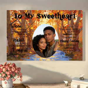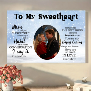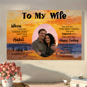 Turn your most cherished photo and deepest feelings into a timeless work of art. This personalized canvas print lets you craft a unique love story. Upload a photo of you and your loved one, choose a romantic background, and add a heartfelt title and message. Featuring the powerful quote that begins "When I tell you 'I LOVE YOU' I don't say it out of Habit...", it’s a profound declaration of love, perfect for celebrating the one who is your "Happy Ending".