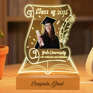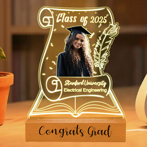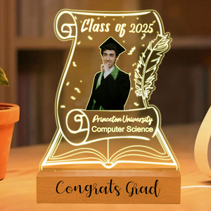 Honor the hard work and success of the 2025 graduate with this elegant Graduation Scroll Night Light. This unique lamp, shaped like an open book with a classic scroll design, lets you create a personal tribute. Upload a photo in cap and gown, customize it with their university, major, and a personal message, and watch as it glows with pride. Itâs the perfect way to commemorate their journey and light the way to their bright future.