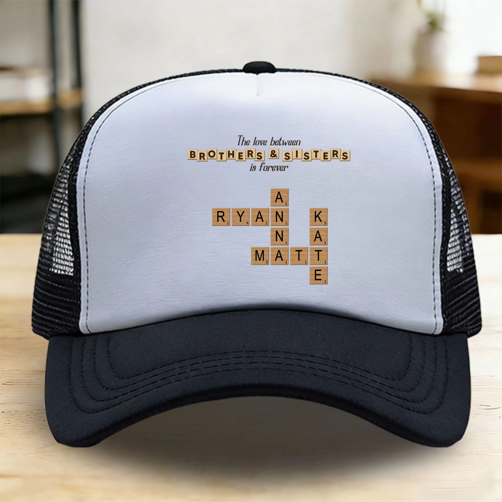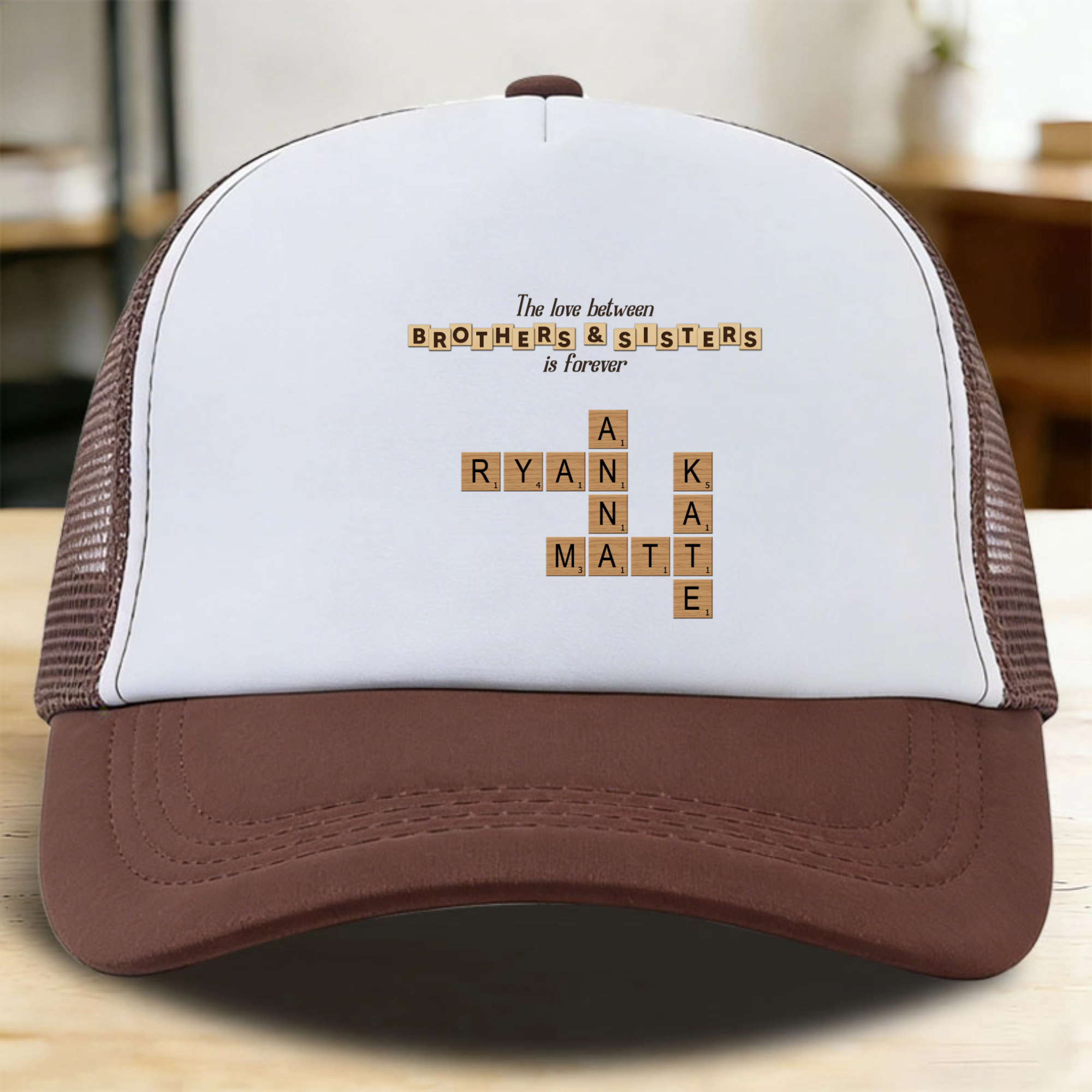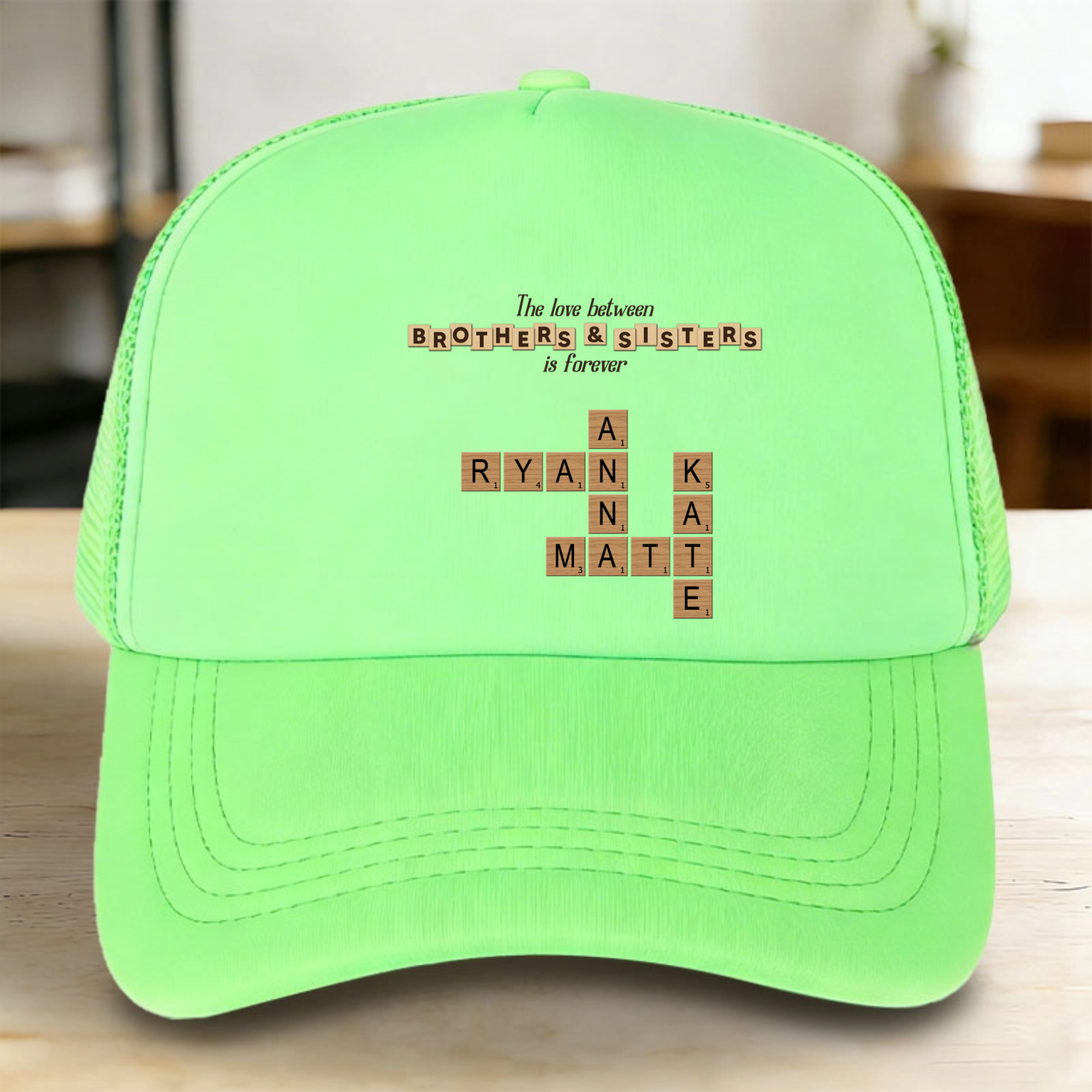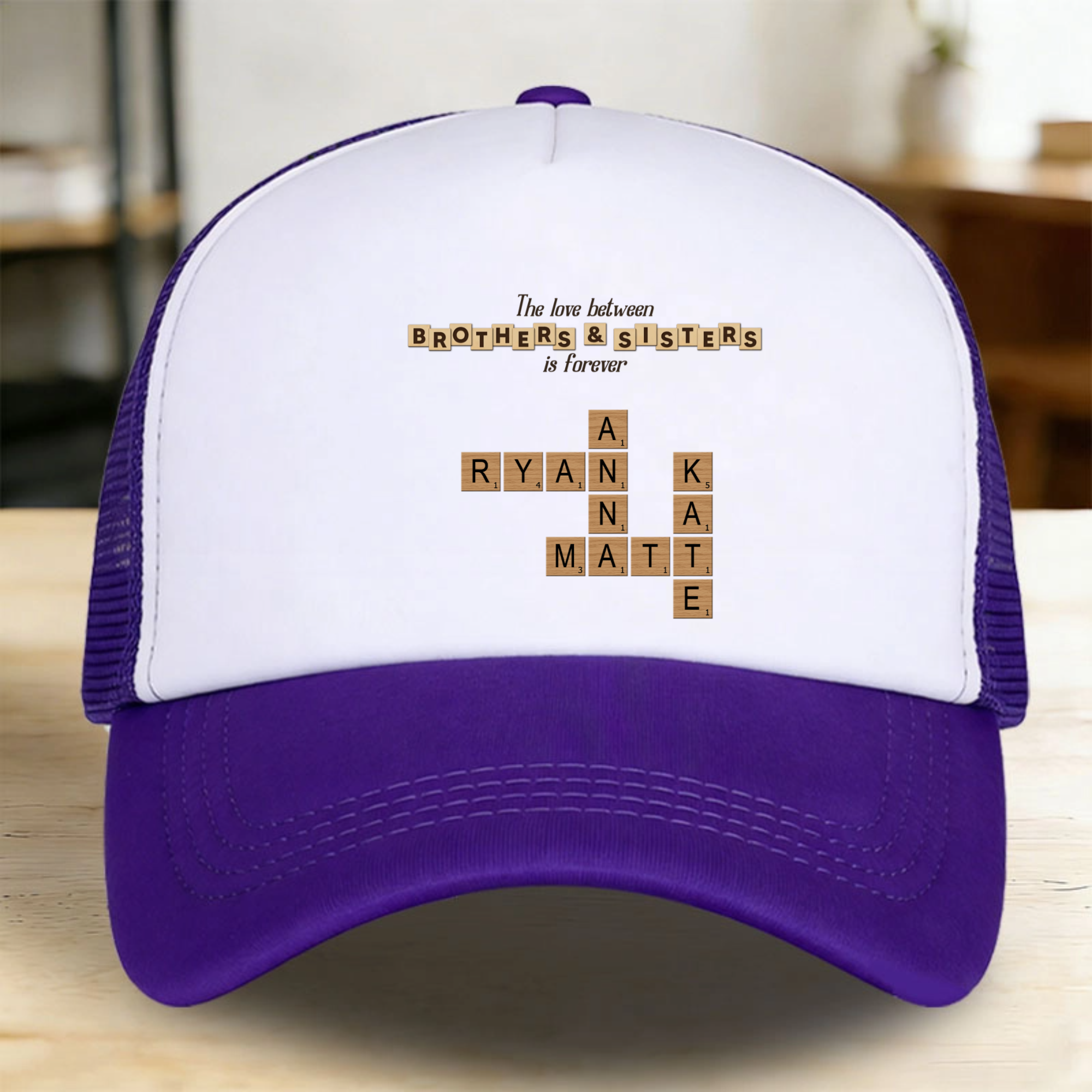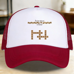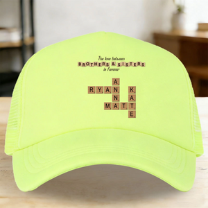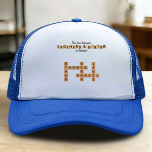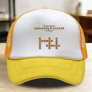 Honor the unique and unbreakable connection between siblings with our personalized Sponge Mesh Crossword Cap. This breathable, adjustable hat features a clever crossword puzzle design on the front, created from the names of your brothers and/or sisters. Emblazoned with the heartfelt message "The love between BROTHERS & SISTER(S) is forever", it’s a creative and stylish tribute to family. Choose from 10 vibrant colors to create a one-of-a-kind accessory that celebrates your specific family story.