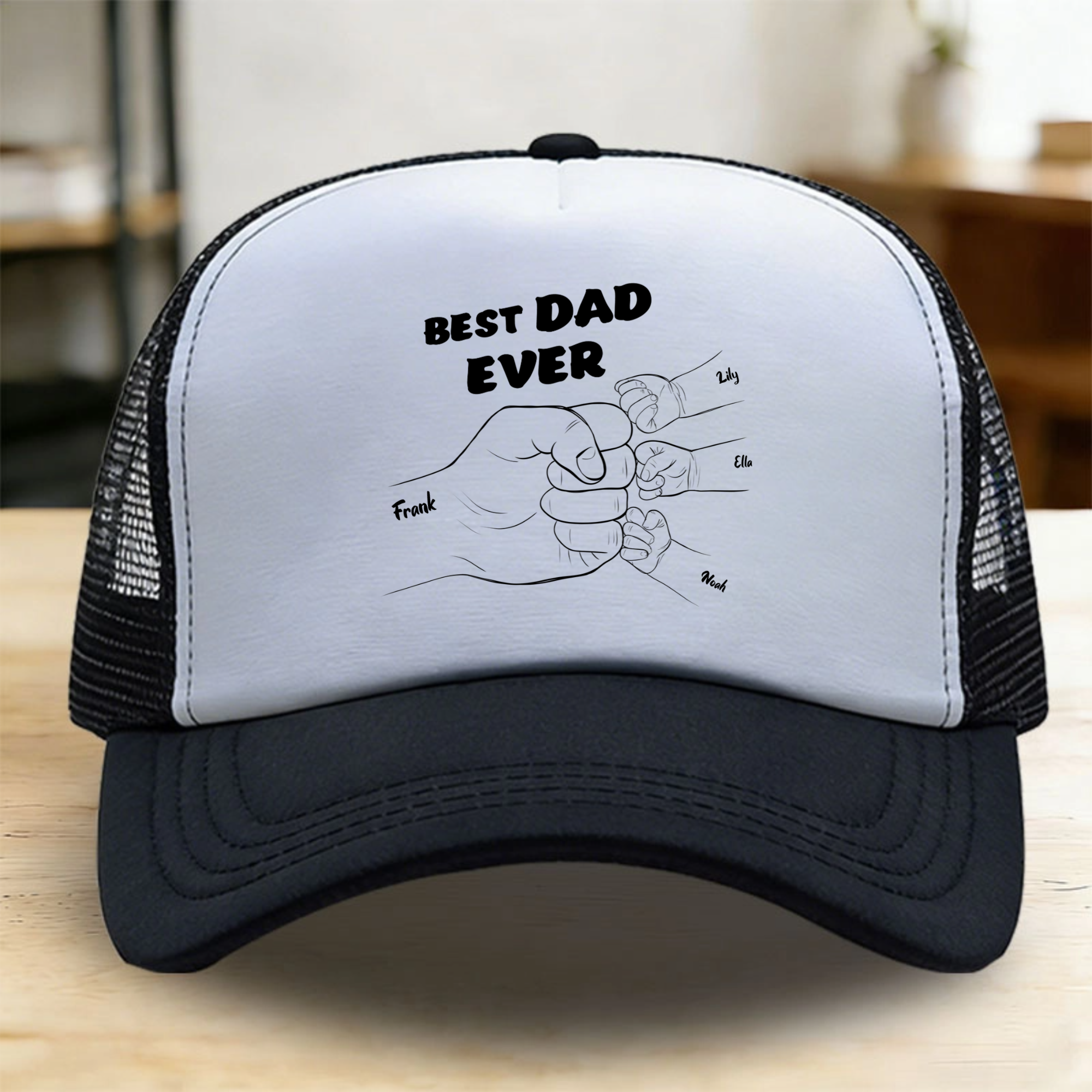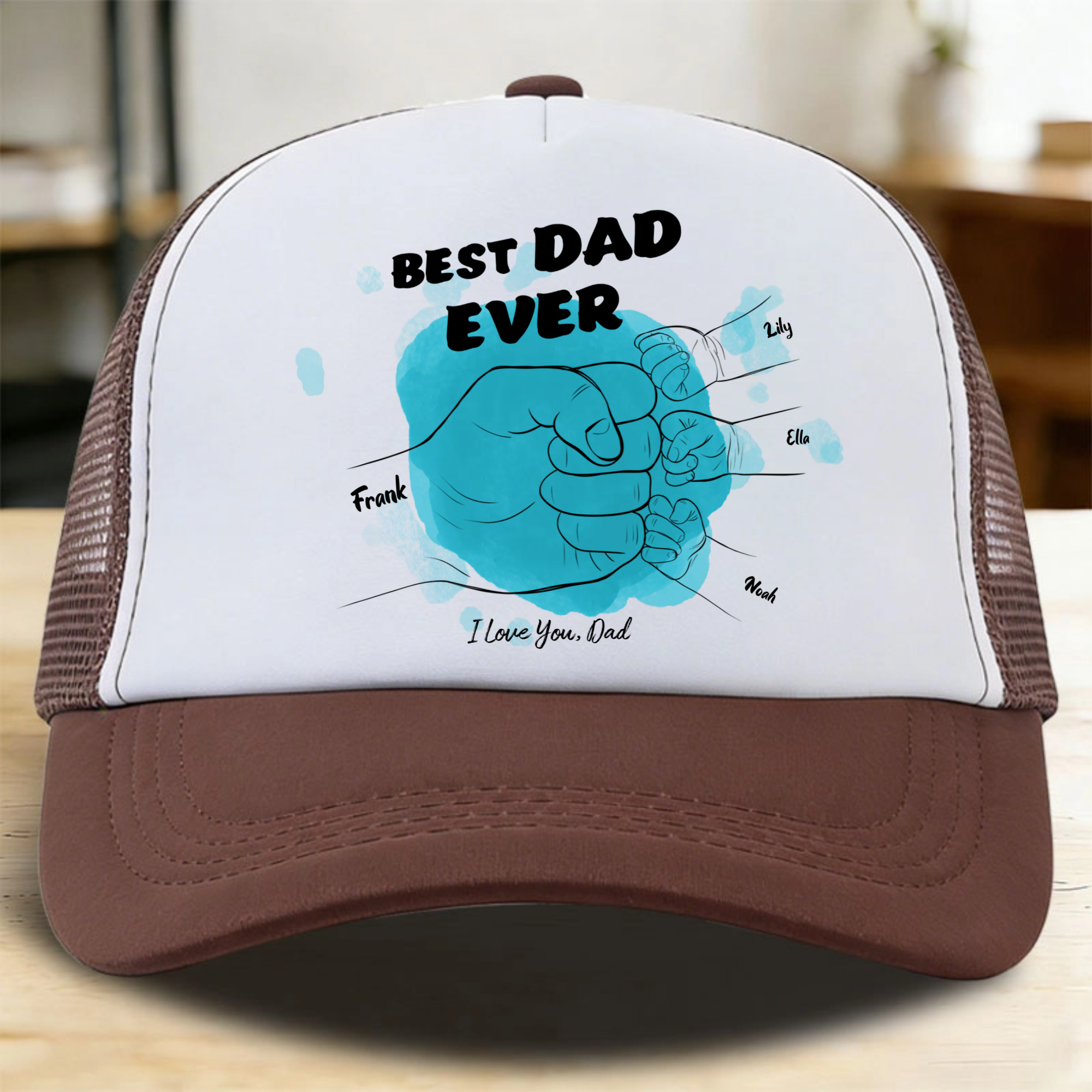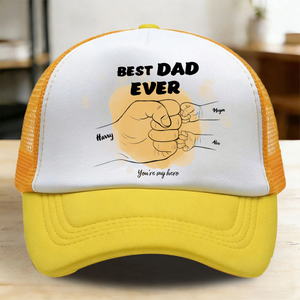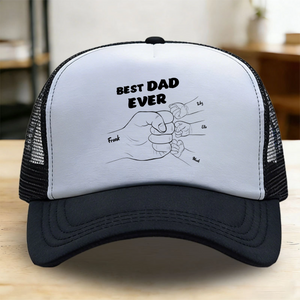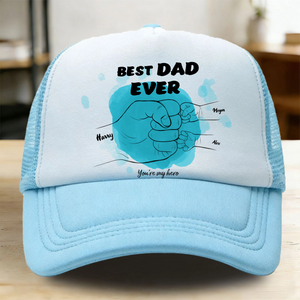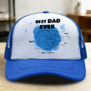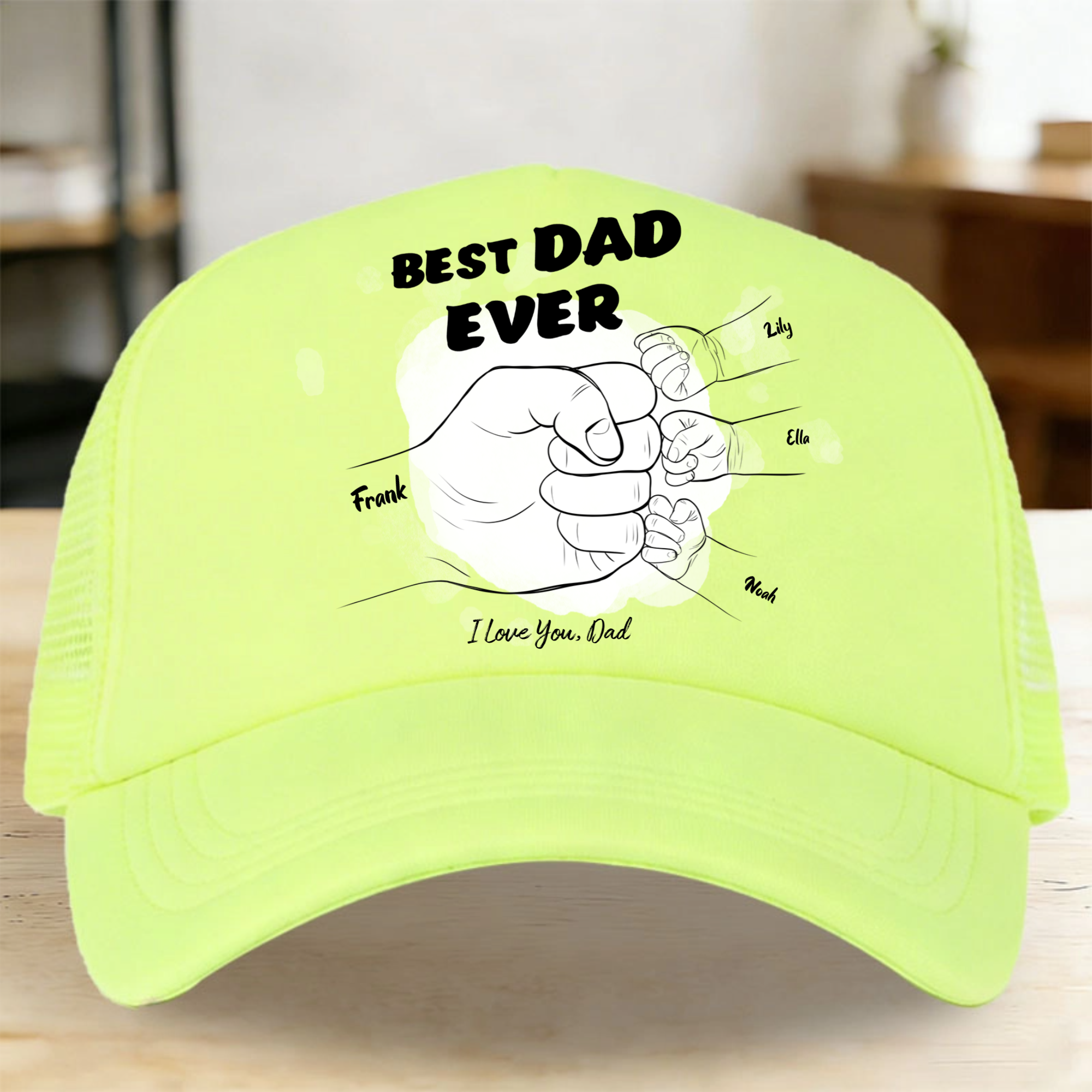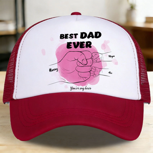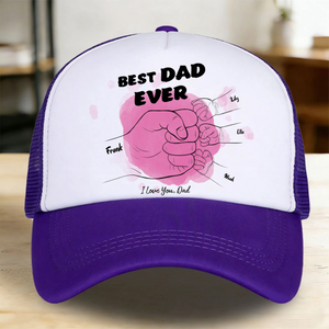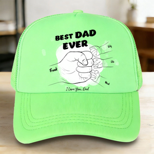 Celebrate the hero in your life with a cap that speaks from the heart. Our Sponge Mesh Baseball Cap lets you create a unique, heartfelt tribute for Dad. Customize the main message, choose a background color, and add the names of your family members around a touching fist bump design. Available in 10 vibrant colors, itâs the perfect, breathable accessory to show your love on Fatherâs Day, his birthday, or any day he deserves to be honored.