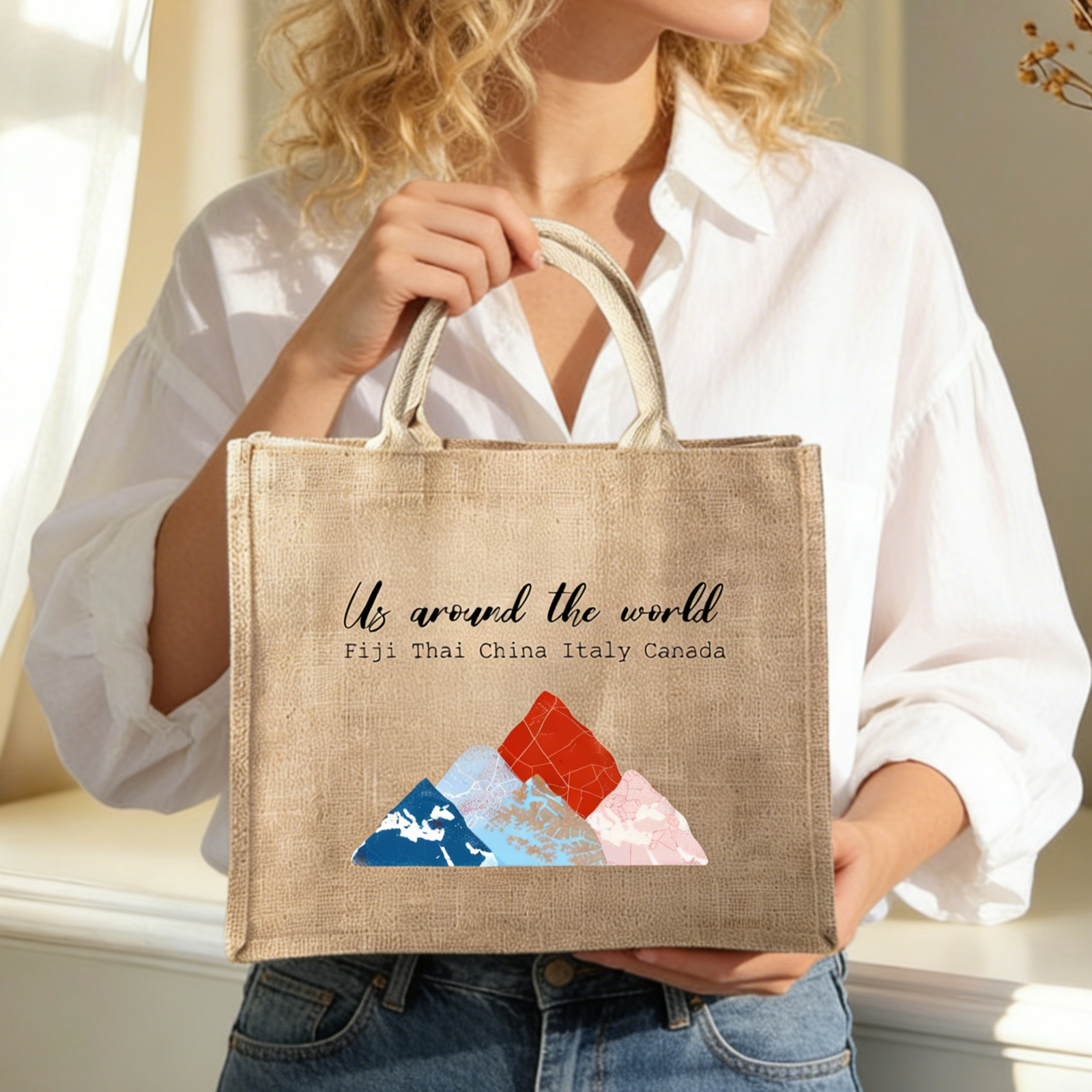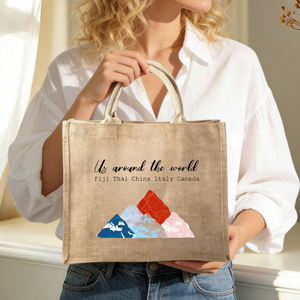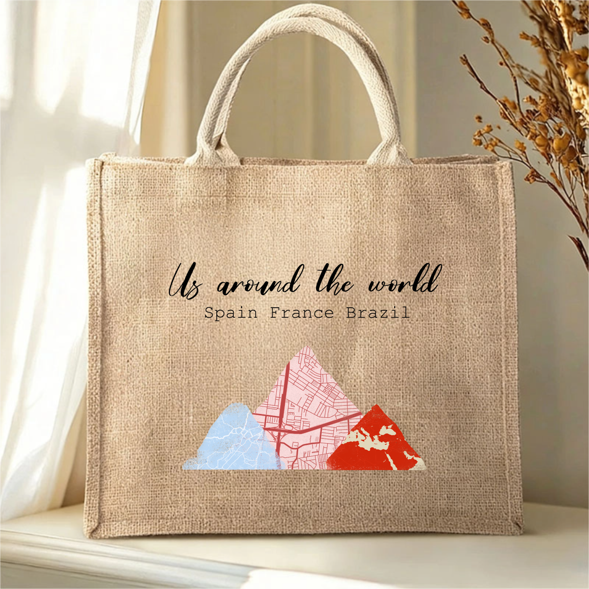 Where have you been, and what’s your story? This isn’t just a bag; it’s a canvas for your adventures. Our personalized travel tote lets you map your memories. Choose 1 to 9 colorful map pieces to represent the places you've explored or dream of visiting. Then, add your own title (like the classic "Us around the world") and a custom subtitle listing your special destinations. Made from natural jute with a waterproof lining, it’s the perfect, practical companion for your next chapter, near or far.