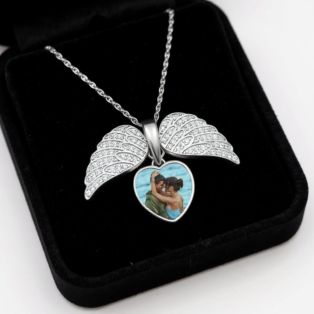 Carry the memory of a cherished person close to your heart, forever. This exquisite Winged Heart necklace is a stunning tribute to love, protection, and special bonds. Featuring a pair of angel wings adorned with sparkling crystals, it cradles a heart-shaped photo frame where you can place a picture of your loved one.Ā