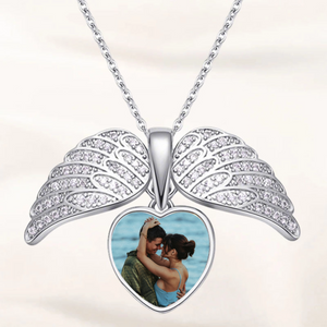 Design: Features a stunning pair of angel wings as the main decorative element, intricately textured. The wings cradle a heart-shaped photo frame that can hold a custom picture.
