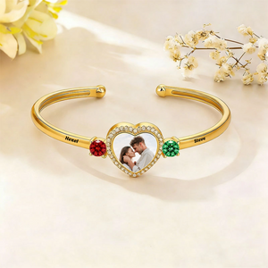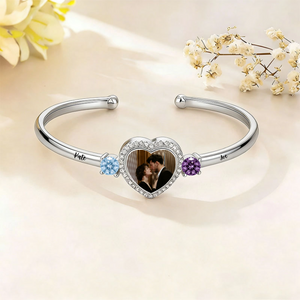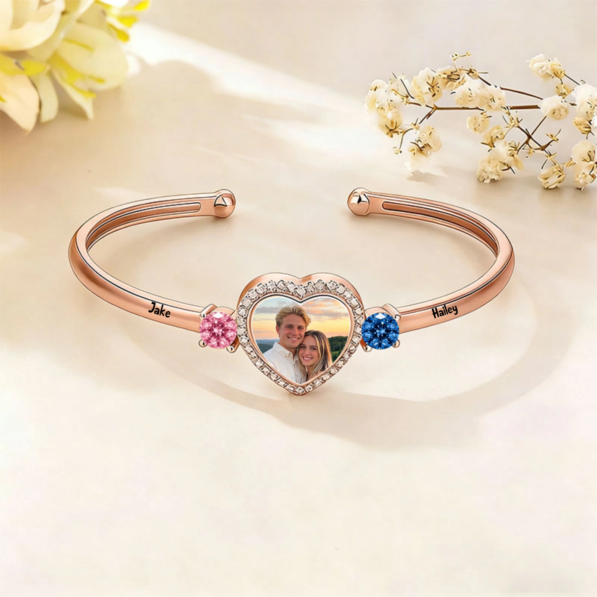 Design: The centerpiece is a beautiful heart-shaped photo frame, surrounded by a halo of small, clear crystals. On either side of the heart, there are settings for two customizable birthstones. The inner curve of the bangle is engraved with two personalized names.