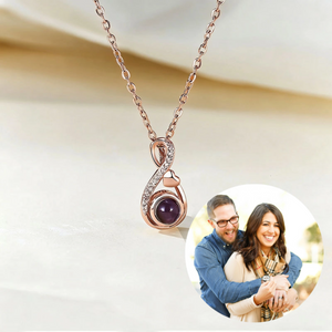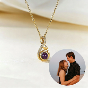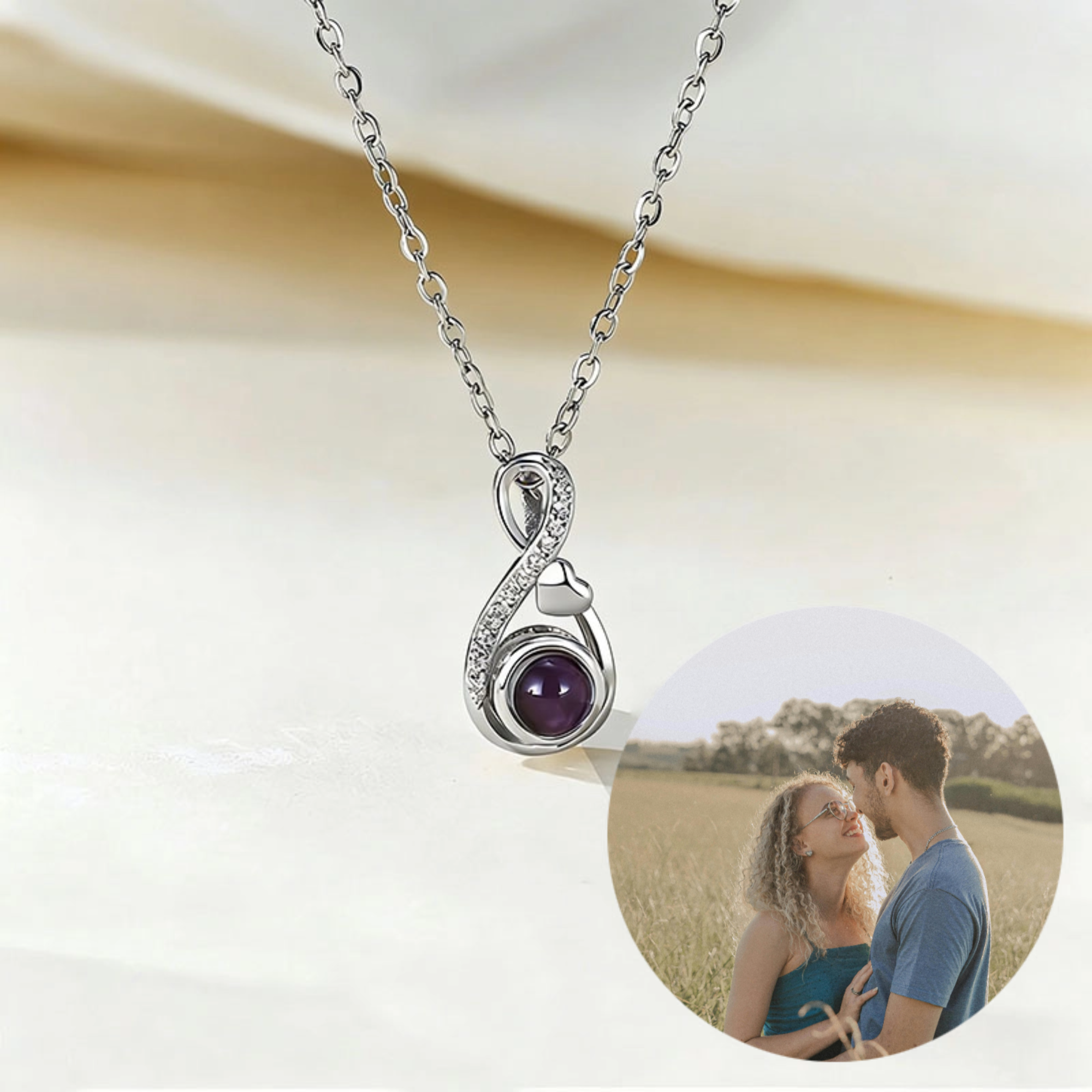 Pendant Design: An infinity symbol elegantly loops to form a heart shape, symbolizing endless love. The heart features a central projection stone for your photo, surrounded by a halo of sparkling clear crystals.