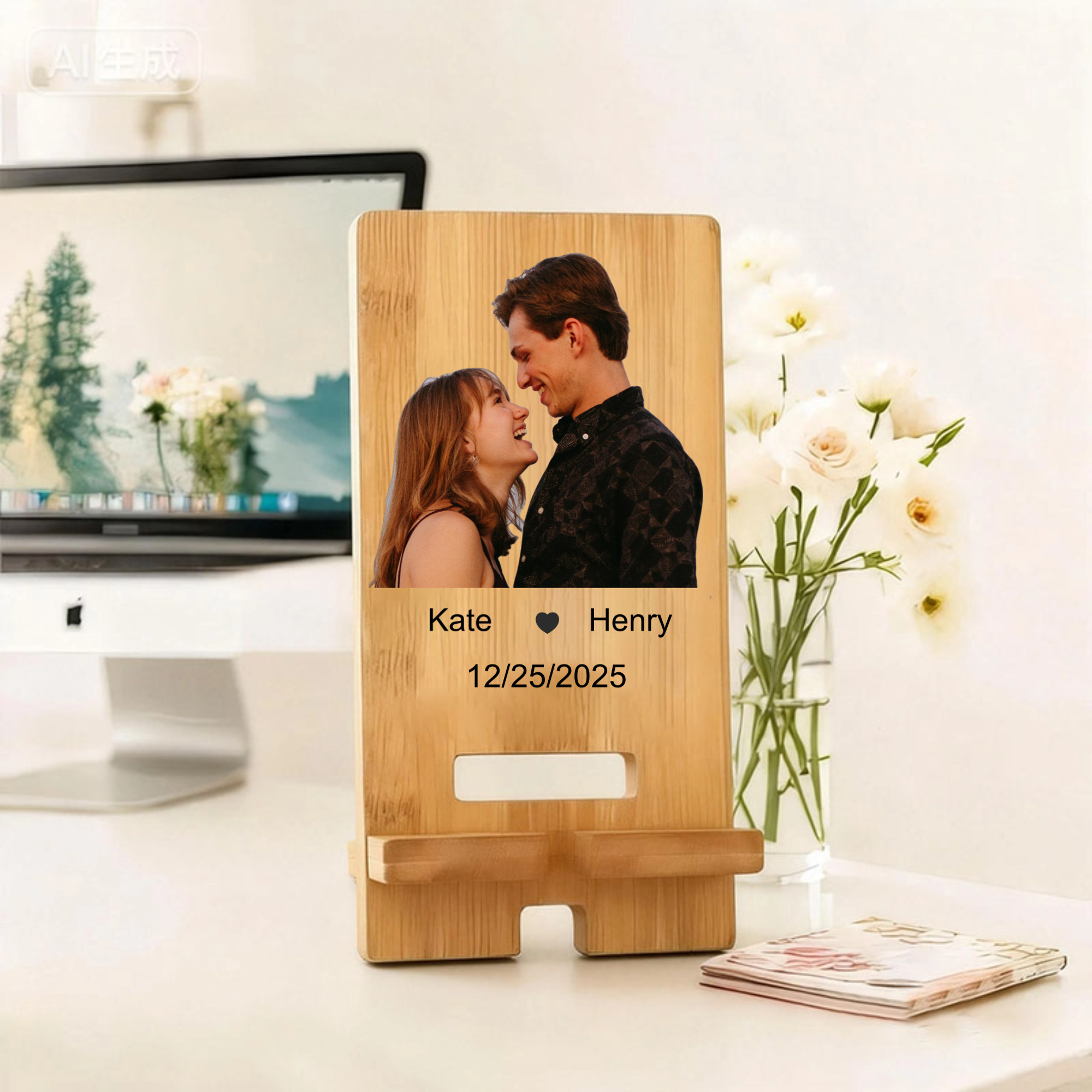 Custom Couple bamboo Phone Stand, Perfect for Anniversaries, Valentineās Day, Weddings, Birthdays
