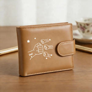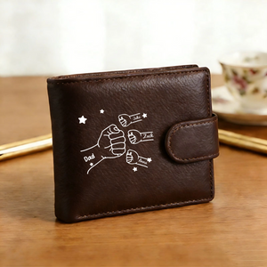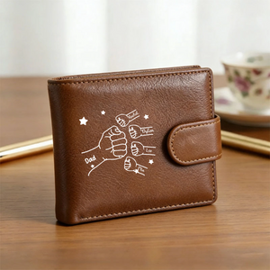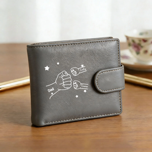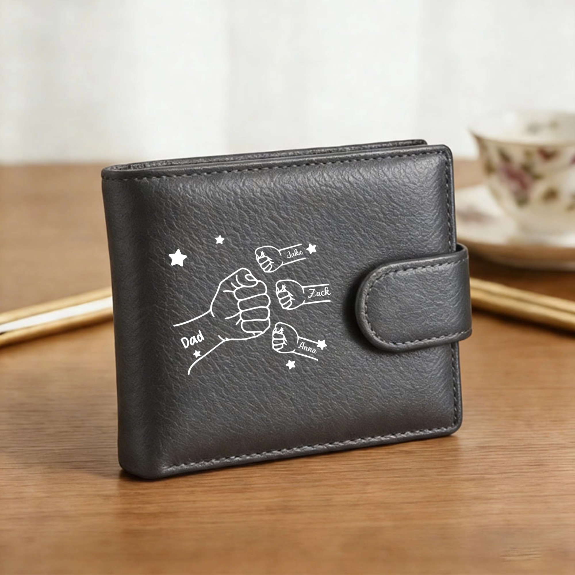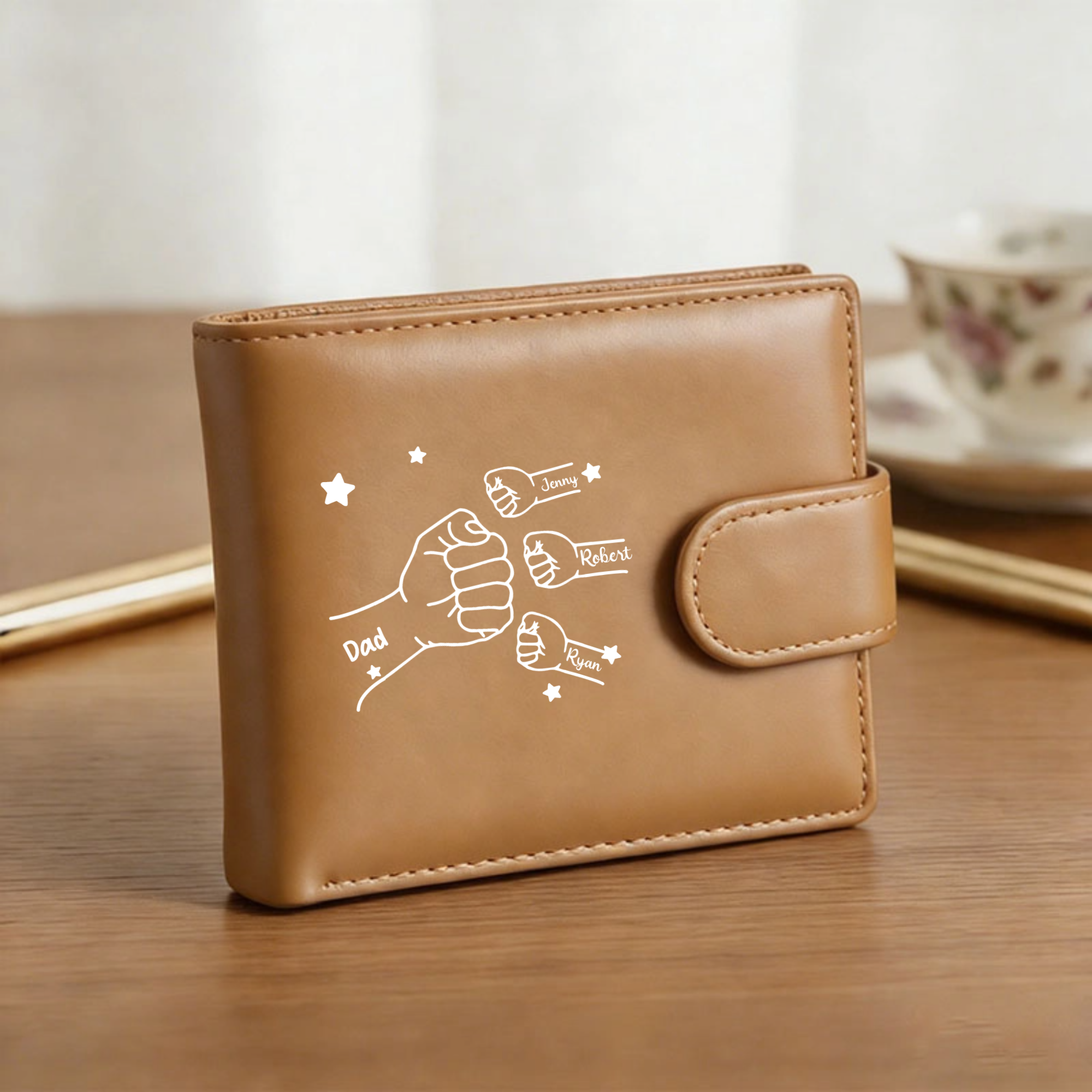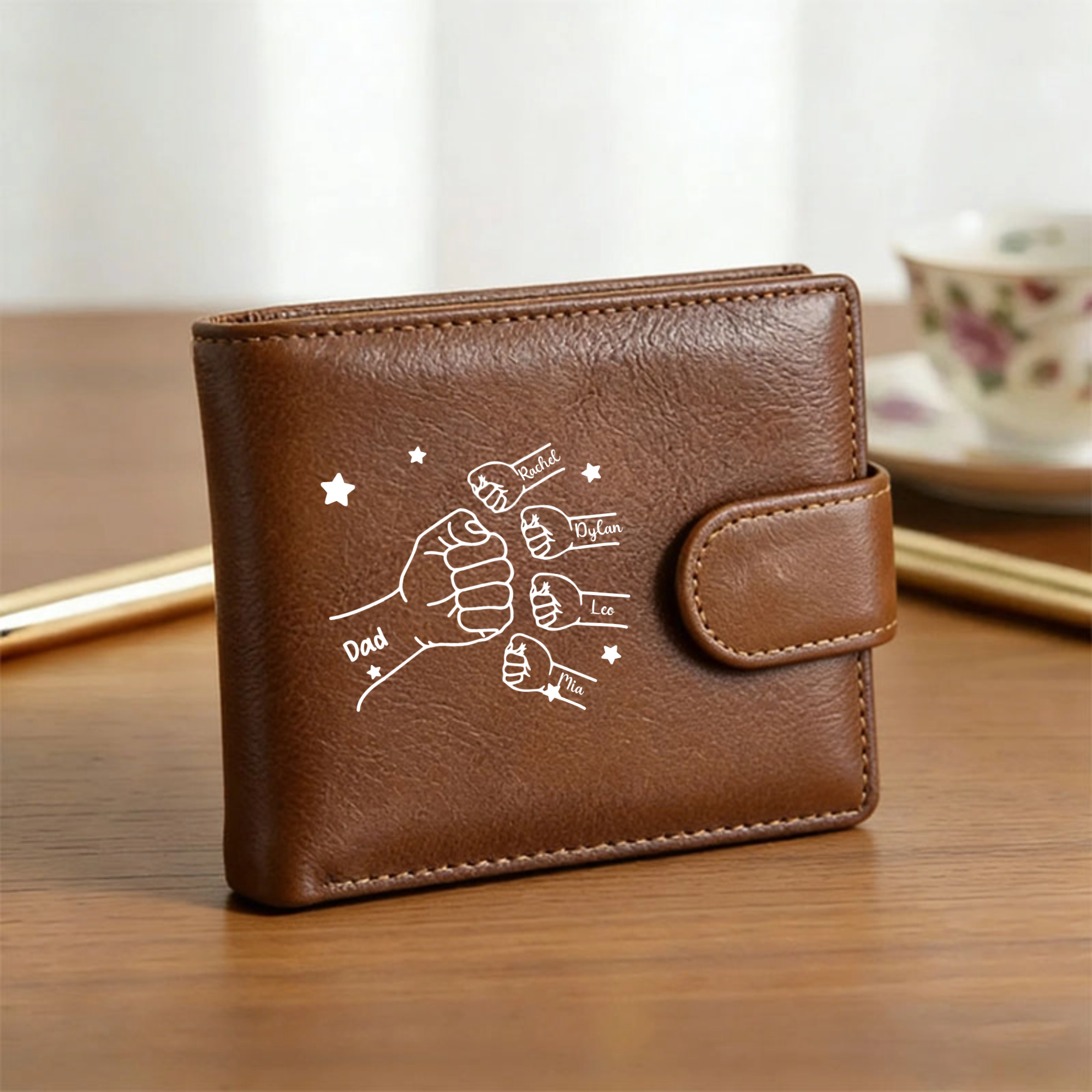 Celebrate the worldâs best dad with a wallet that carries his whole crew. Our personalized leather wallet features a unique fist bump graphic, where Dadâs hand is connected to 1-6 smaller hands, each labeled with a childâs name.Made from genuine leather and packed with practical features, itâs a daily reminder of the team that looks up to him.