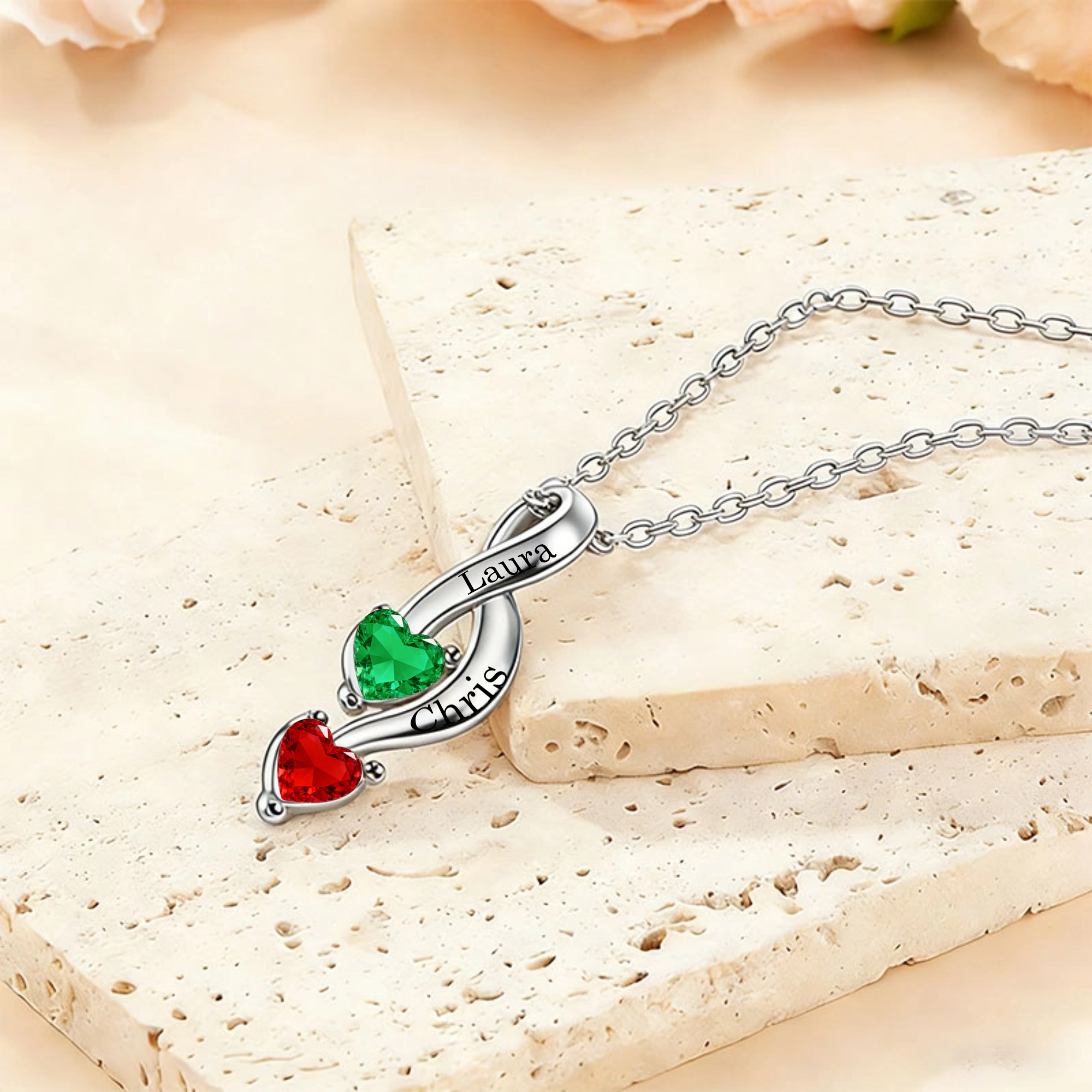 Design: The pendant is a gracefully twisted bar or infinity-shaped link, with two settings for heart-shaped birthstones. The center is engraved with your two custom names.